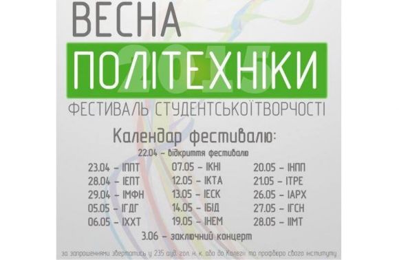 «55-й традиційний фестиваль студентської творчості «Весна політехніки» цього року стане однією з найважливіших подій у житті Університету. «Весна політехніки» огорне кожного теплом та ніжністю, подарує багато усмішок та зворушливих моментів...