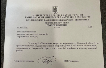 З 12 вересня масковий режим буде запроваджено для студентів і працівників Львівського фахового коледжу харчової і переробної промисловості.