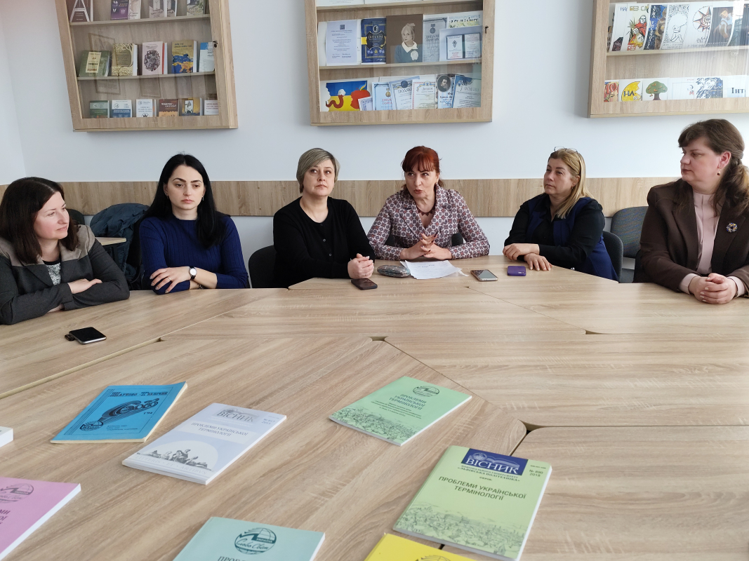 Старша викладачка Ірина Шмілик презентувала профорієнтаційні й маркетингові заходи кафедри, які її викладачі здійснюють не лише в Політехніці, та поділилася спогадами про найяскравіші зустрічі, що найбільше запам’яталися. Доцентка Софія Булик-Верхола розповіла про участь кафедри у проєкті «Гостьовий лектор», а її колега, теж доцентка, Мирослава Гнатюк — про цикл науково-освітніх зустрічей «Мовознавці актуалізують». Доцентка Оксана Микитюк зробила екскурс у науковий шлях своїх колег, зокрема зосередилася на дослідженнях, що стосуються української термінології.