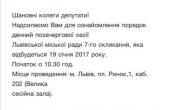 Депутат Львівської міської ради й голова виконкому громадської організації «Варта 1» Ігор Зінкевич написав сьогодні, 18 січня, на своїй сторінці в інтернет-мережі «Facebook», що секретаріат ЛМР надіслав йому для ознайомлення порядок денний її позачергової сесії, яка розпочнеться 19 січня о 10.30. Ігор Зінкевич також опублікував скріншот повідомлення секретаріату ЛМР.