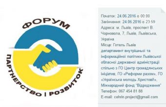 організовує Форум департамент внутрішньої та інформаційної політики Львівської обласної державної адміністрації спільно з ГО Центр громадянських ініціатив, ГО «Реформи разом», ГО «Розвиток громади», ГО «Українська молодь Христові!», Міжнародним фондом «Відродження» та ГО «Центр «Жіночі перспективи». Для реєстрації у форумі необхідно до 22 червня заповнити анкету за посиланням https://docs.google.com/forms/d/1JapqPJgFKZ36SafFOVnx6—Idoq2edrg-FVP0-Q6Nm4/viewform».
