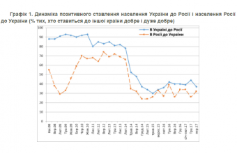 Ставлення українців до Росії суттєво залежить від регіону – на Заході позитивно ставляться до Росії 31%, в Центрі теж 31%, на Півдні – 45%, на Сході – 54%. Ставлення населення України до Росії залишається кращим ніж ставлення населення Росії до України впродовж усього періоду спостережень. Кількість позитивно налаштованих українців з травня 2017 зменшилася з 44% до 37%, а кількість позитивно налаштованих до України росіян зросла з 26% до 32%).
