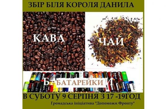 Громадський активіст Люба Возняк повідомляє в п’ятницю, що в суботу, 9 серпня зі 17.00 до 19.00 біля пам’ятника королю Данилу у Львові традиційно збиратимуть необхідне українським військовикам. Цього разу – каву, чай і батарейки для ліхтариків. Активіст також пише: