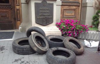 Правий сектор Львівщини почав безстрокову акцію протесту під ОДА. Зносять шини», - повідомили сьогодні, 11 липня, на сторінці «Громадське. Львів» в інтернет-мережі «Facebook», розмістивши фотографію з місця події.