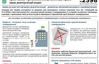 У листі до голови Верховної Ради Дмитра Разумкова, голів депутатських фракцій та груп та ряду парламентських комітетів Асоціація міст України заявила, заявила, що не підтримує проєкт Закону України «Про внесення змін до Конституції України (щодо децентралізації влади)» №2598 від 27 грудня 2019 року.