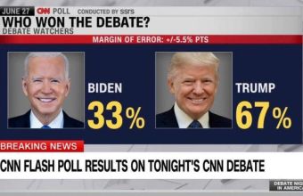 Опитування, проведене CNN серед телеглядачів дебатів, зафіксувало, що у них переміг республіканець Дональд Трамп. Його підтримали 67% опитаних, демократа Джо Байдена — 33%.