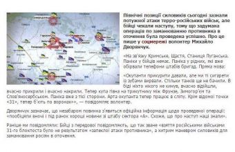 «Північні позиції силовиків сьогодні зазнали потужної атаки терро-російських військ, але бійці чекали наступу, тому що задумана операція по заманюванню противника в оточення була проведена успішно. Про це пише у соцмережі («Facebook». – «ЩЛ») волонтер Михайло Дворянчук.