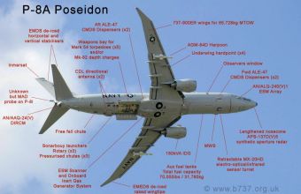 Boeing P-8 Poseidon може нести до 9 тонн озброєння, має 5 внутрішніх та 6 зовнішніх точок підвіски, для різних типів озброєння (AGM-84 Гарпун, Mark 54 (торпеда), морські міни, авіабомби)