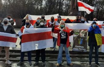 Білоруси Львова провели акцію солідарності з політв'язнями і проти купівлі білоруських автобусів МАЗ міською владою українського міста.