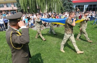 Четверо військовиків підняли національний стяг на площі біля Центру Довженка у Львові