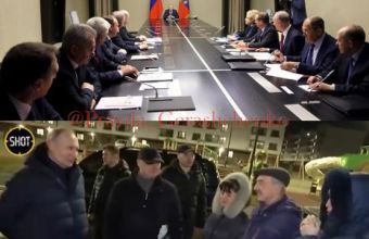 На першому фото вгорі – Путін на нещодавньому засіданні Радбезу. На другому – нібито він же у Маріуполі спілкується з "випадковими городянами". Далеко - від соратників і близько - з незнайомою публікою. Це означає лише одне: Маріуполь відвідував двійник Путіна, якого використовують під час масових заходів.