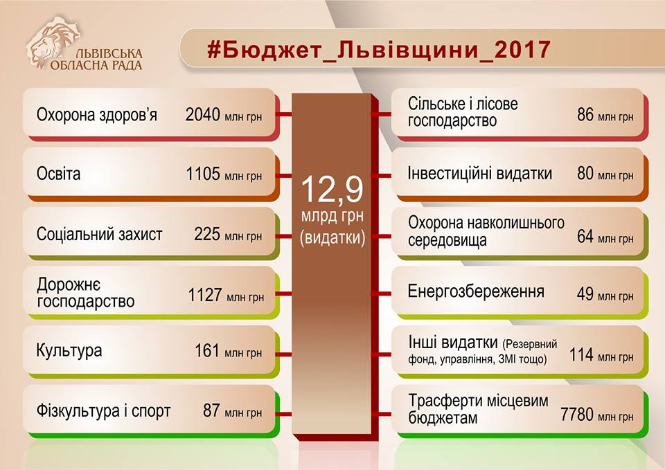 Депутати Львівської обласної ради ухвалила бюджет на 2017 рік. «За» проголосував у четвер, 22 грудня, 51 депутат. Про це повідомили в прес-службі Львівської міськради, де також поінформували: «Відтак, доходи обласного бюджету становлять більше 12, 9 млрд. гривень у тому числі загального фонду – 11,5 млрд. гривень, спеціального фонду – 1,4 млрд. гривень, з них бюджет розвитку – 50 мільйонів гривень. З них 7780 мільйонів гривень скерують на трансферти місцевим бюджетам, на галузь охорони здоров’я – 2040 мільйонів гривень, освіти – 1105 мільйонів гривень, на соціальний захист – 225 мільйонів гривень, на дорожнє господарство – 1127 мільйонів гривень, культуру – 161 мільйонів гривень та інші видатки».
