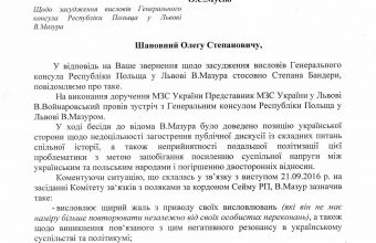 Народний депутат Олег Мусій повідомив сьогодні, 8 листопада, що на його вимогу - оголосити Генерального консула Республіки Польща у Львові Вєслава Мазура персоною нон ґрата в Україні за його висловлювання щодо Степана Бандери, Міністерство закордонних справ провело з ним «виховну бесіду». Відтак той визнав свою неправоту і запевнив, що антиукраїнська риторика більше не повториться.