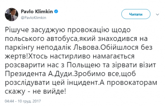 Міністр закордонних справ Павло Клімкін заявив із цього приводу на своєму акаунті в Twitter: «Рішуче засуджую провокацію щодо польського автобуса,який знаходився на паркінгу неподалік Львова. Обійшлося без жертв! Хтось настирливо намагається розсварити нас з Польщею та зірвати візит президента Анджея Дуди. Зробимо все,щоб розслідувати цей інцидент. А провокаторам скажу – не вийде!».