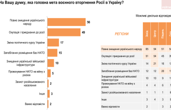 56% вважають, що головна мета вторгнення Росії – це повне знищення українського народу, і ця думка домінує в усіх регіонах України. Ще половина вважають, що ціль нападу – окупація України і приєднання до Росії. Тільки 15-17% думають, що Росія переслідує мету змінити політичний курс України чи запобігти розміщенню баз НАТО, 10% – вважають, що мотивом є знищення військової інфраструктури, 5% – провокування НАТО на війну. Тих хто вважає, що вторгнення Росії мало за мету захистити російськомовних – лише 2%.