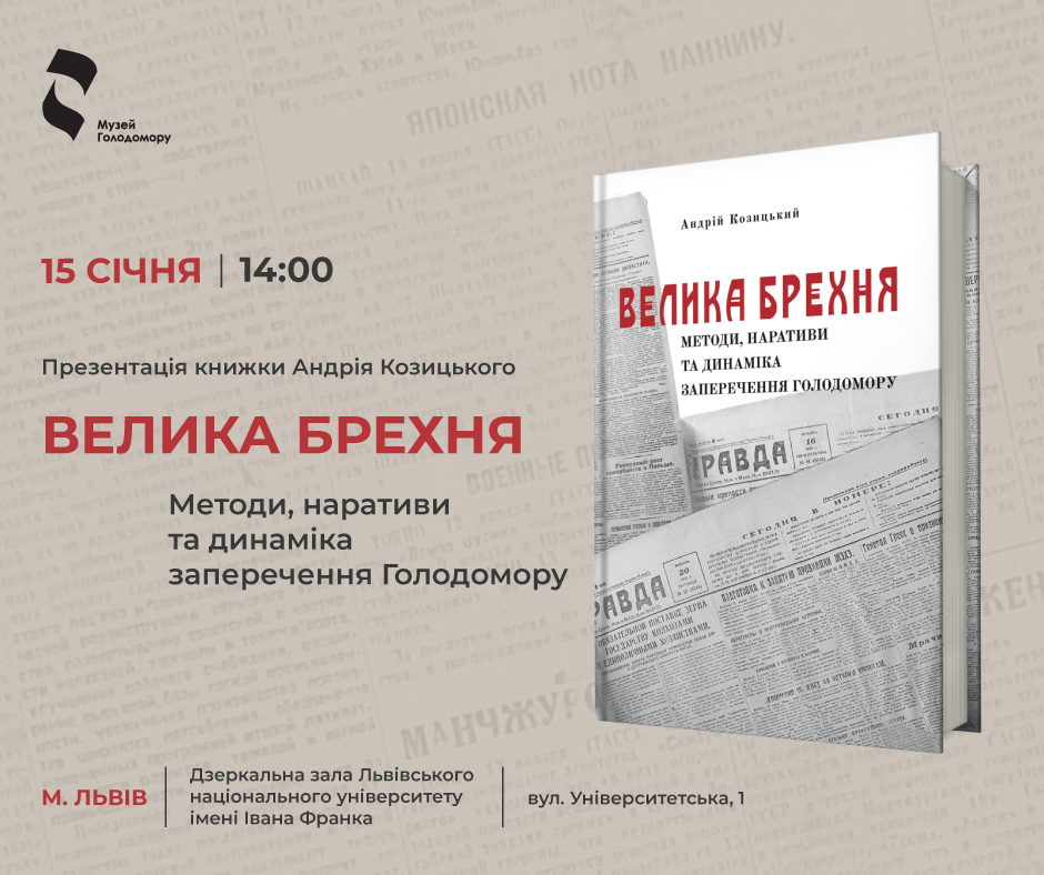 У Львоі 15 січня відбудеться презентація книжки історика Андрія Козицького «Велика брехня. Методи, наративи та динаміка заперечення Голодомору». Про це повідомив Музей Голодомору, пише DailyLviv.com.