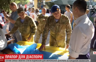 «Волонтери та десантники підписали у Львові для діаспори для кордоном сотню українських прапорів. На прапорах – побажання, гасла своєї бригади і намальовані парашути. Далі ці стяги передадуть українцям в Америці, Канаді, Польщі, Туреччині, Єгипті та інших країнах. 23-го серпня у День національного прапора ці стяги замайорять у понад 10 країнах світу», – поінформували в «Телевізійній службі новин» каналу «1+1». Подробиці – в його відеосюжеті: