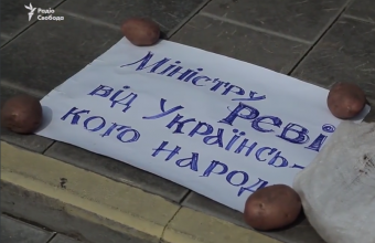 У понеділок, 14 серпня, громадські активісти принесли мішок картоплі та овочі до приміщення департаменту соціального захисту Львівської облдержадміністрації з проханням передати їх міністрові соціальної політики Андрієві Реві.