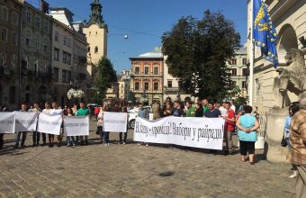 Активісти зібралися на площі Ринок перед будівлею міської ради вранці 9 червня. Вони «озброїлися» плакатами «Владу – громаді! Вибори у райради!», «Децентралізація = райради», «Садовий, даєш райради!».
