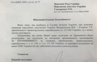 «Таку інформацію я отримав від Офісу генпрокурора у відповідь на мою заяву про вчинення дій Медведчуком і Козаком, які підпадають під статтю 111 Кримінального Кодексу України (державна зрада). Мою заяву долучили до матеріалів кримінального провадження, яке уже ведеться Державним бюро розслідувань», - повідомив Гончаренко.