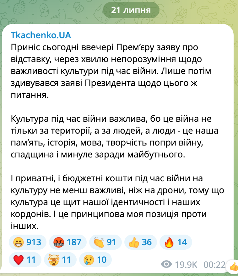 Dailylviv.com подає повний текст повідомлення Олександра Ткаченка: "Приніс сьогодні ввечері Прем’єру заяву про відставку, через хвилю непорозуміння щодо важливості культури під час війни. Лише потім здивувався заяві Президента щодо цього ж питання.