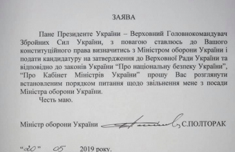 Міністр оборони України Степан Полторак написав заяву щодо розгляду питання його звільнення з посади керівника військового відомства.