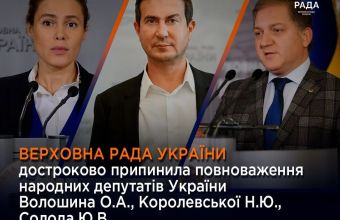 Верховна Рада України прийняла рішення про дострокове припинення повноважень народних депутатів України Волошина О.А., Королевської Н.Ю., Солода Ю.В. Повноваження народних депутатів припинено за особистими заявами.