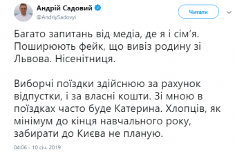 Натомість Андрій Садовий заявив: «Багато запитань від медіа, де я і сім’я. Поширюють фейк, що вивіз родину зі Львова. Нісенітниця. Виборчі поїздки здійснюю за рахунок відпустки, і за власні кошти. Зі мною в поїздках часто буде Катерина. Хлопців, як мінімум до кінця навчального року, забирати до Києва не планую».