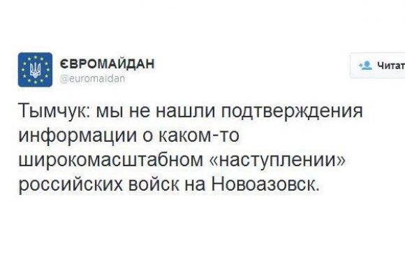 Про це повідомляється у вівторк на сторінці прес-центру АТО в інтернет-мережі «Facebook». Своєю чергою, координатор спільноти військових фахівців «Інформаційний Спротив» Дмитро Тимчук повідомляє сьогодні, 26 серпня: «З півдня приходять тривожні повідомлення, але ми не знайшли підтвердження інформації про якийсь широкомасштабний «наступ» російських військ на Новоазовськ (за нашими даними, відзначаються бойові зіткнення в цьому районі, але мова йде про сили противника, які прорвалися раніше й котрих досі не знищили – ця інформація на даний момент уточнюється)».