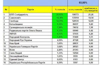 За даними опрацювання 93% бюлетенів, «БПП «Солідарність» набрала в нашій області 21,03% виборців, «Самопоміч» – 14,38%, «Свобода» – 12,75%, «Батьківщина» – 9,1%, «Громадянська позиція» – 7,9%, «Радикальна партія Олега Ляшка» – 6,35%, «УКРОП» – 6,13%, «Народний Контроль» – 5,45%, «Народний Рух України» – 4,99%. Про це повідомили сьогодні, 26 жовтня, на сторінці Львівської обласної виборчої комісії в інтернет-мережі «Facebook».