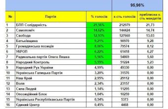 За даними опрацювання 95,96% бюлетенів, «БПП «Солідарність» набрала в нашій області 21,56% виборців, «Самопоміч» – 14,62%, «Свобода» – 12,93%, «Батьківщина» – 9,21%, «Громадянська позиція» – 8,06%, «УКРОП» – 6,22%, «Радикальна партія Олега Ляшка» – 5,56%, «Народний Контроль» – 5,19%, «Народний Рух України» – 4,99%. Про це повідомили сьогодні, 26 жовтня, на сторінці Львівської обласної виборчої комісії в інтернет-мережі «Facebook».