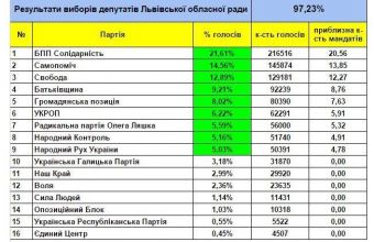 За даними опрацювання 97,23% бюлетенів, «БПП «Солідарність» набрала в нашій області 21,61% виборців, «Самопоміч» – 14,59%, «Свобода» – 12,89%, «Батьківщина» – 9,21%, «Громадянська позиція» – 8,02%, «УКРОП» – 6,22%, «Радикальна партія Олега Ляшка» – 5,59%, «Народний Контроль» – 5,16%, «Народний Рух України» – 5,03%. Про це повідомили сьогодні, 26 жовтня, на сторінці Львівської обласної виборчої комісії в інтернет-мережі «Facebook».