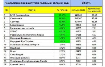 За даними опрацювання 98,54% бюлетенів, «БПП «Солідарність» набрала в нашій області 21,57% виборців, «Самопоміч» – 14,53%, «Свобода» – 12,9%, «Батьківщина» – 9,2%, «Громадянська позиція» – 8%, «УКРОП» – 6,21%, «Радикальна партія Олега Ляшка» – 5,64%, «Народний Контроль» – 5,18%, «Народний Рух України» – 5,07%. Про це повідомили сьогодні, 26 жовтня, на сторінці Львівської обласної виборчої комісії в інтернет-мережі «Facebook».