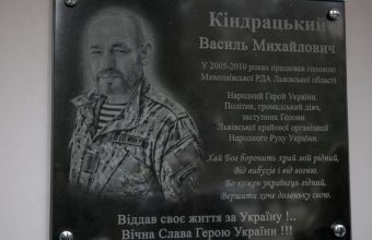 «У місті Миколаєві відкрили меморіальну дошку Василеві Кіндрацькому, колишньому голові Миколаївської районної державної адміністрції, який загинув минулого року під час проведення антитерористичної операції в Донецькій області. Він був заступником командира батальйону ОУН-ЗСУ.