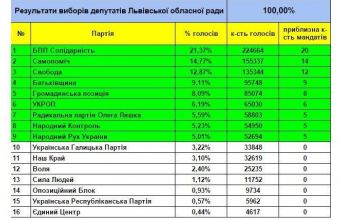 За даними опрацювання 100% бюлетенів, «БПП «Солідарність» набрала в нашій області 21,37% виборців, а відтак – буде представлена в облраді приблизно 20-ма депутатами, «Самопоміч» – 14,77% (приблизно 14 депутатів), «Свобода» – 12,87% (приблизно 12 депутатів), «Батьківщина» – 9,11% (приблизно дев’ять депутатів), «Громадянська позиція» – 8,09% (приблизно вісім депутатів), «УКРОП» – 6,19% (шість депутатів), «Радикальна партія Олега Ляшка» – 5,59% (приблизно п’ятеро депутатів), «Народний Контроль» – 5,23% (приблизно п’ятеро депутатів), «Народний Рух України» – 5,01%. Про це повідомили сьогодні, 29 жовтня, на сайті Львівської обласної виборчої комісії.