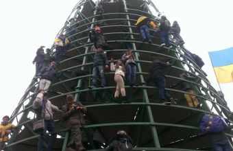 «У Києві на Майдані Незалежності частина мітингувальників залізла на каркас ялинки, яку вже встигли встановити комунальники, і намагається його розібрати. На вершині хтось встановив прапорець ЄС, передає кореспондент ТСН.