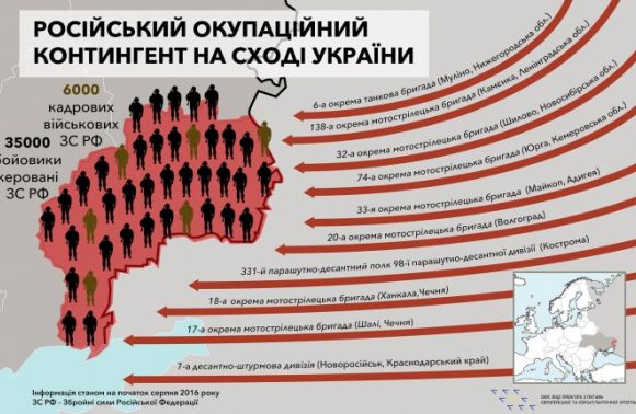 Зокрема, за даними Генштабу, на Донбасі перебувають 6000 російських кадрових військових. Серед них – військові 6-ї окремої танкової бригади (Муліно в Нижегородській області РФ), 138-ї окремої мотострілецької бригади (Камєнка в Ленінградській області РФ), 32-ї окремої мотострілецької бригади (Шилово в Нижегородській області РФ), 74-ї окремої мотострілецької бригади (Юрга в Кемеровській області РФ), 33-ї окремої мотострілецької бригади (Майкоп в Адигеї). Крім того на сході України воює 20-та окрема мотострілецька бригада (Волгоград), 17-та та 18-та окрема мотострілецька бригада з Чечні, 331-й парашутно-десантний полк 98-ї парашутно-десантної дивізії (Кострома), а також 7-ма десантно-штурмова дивізія з Новоросійська Краснодарського краю.