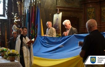 Спочатку в Гарнізонному храмі св. апостолів Петра і Павла відбулося освячення Прапора України, який сьогодні підняли на вежі Ратуші. Біля входу учасників зустрів оркестр Львівського музичного фахового коледжу ім. С. П. Людкевича.