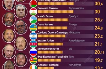 Найдовше при владі. Лукашенко - 6 місце, Алієв - 11-й, Путін - 12-й, Сі Цзіньпін - 18-й, Ердоган - 21-й