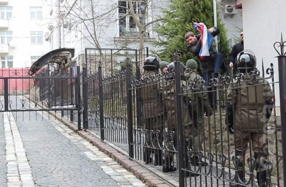 «Більше ми вимагали, щоб зняли російський, саме прапор країни-агресора. Там ніхто нікуди не проривався, я представив свій дипломатичний паспорт, сказав, що я є представником парламенту, показав посвідчення, і після цього вийшов представник, ми з ним зустрілися, я йому сказав: «Зніміть, будь ласка, цей прапор, тому що це неприпустимо, щоб на нашій території майорів прапор країни, яка на нас напала».