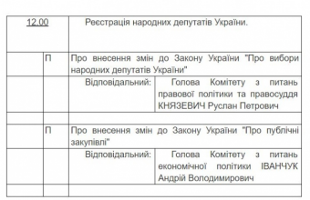 Про це повідомили в середу, 22 травня, в інтернет-виданні «Українська правда», де також розповіли: «Перше з них – внесення змін до закону «Про вибори народних депутатів України». По ньому доповідатиме голова комітету з питань правової політики та правосуддя Руслан Князевич».