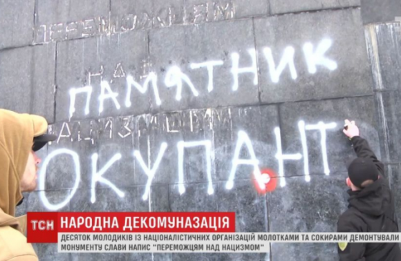 Після цього на місці надпису білою фарбою написали «Пам’ятник окупанту». Та на цьому вони не зупинилися. Націоналісти намагалися збити велику жовту зірку із написом «СССР» та «Победа».