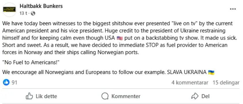 Тож зараз компанія Haltbakk Bunkers припиняє всі продажі збройним силам США та їхнім кораблям.