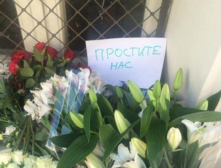 «У Москві під посольством Нідерландів, куди небайдужі громадяни приносять квіти і запалюють свічки в пам'ять про жертв авіакатастрофи Боїнга MH17 «Малайзійських авіаліній», з’явився листок із надписом «Простите нас». Фото виклали користувачі Твітера».