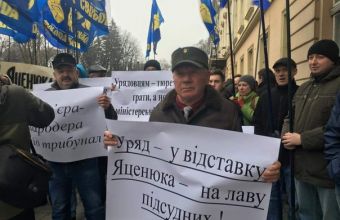 Акція близько ста пікетувальників на вулиці Винниченка проходить під гаслом «Прем’єра-мародера – під трибунал!».