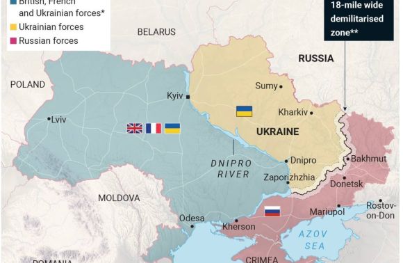 Генерал Кейт Келлог, провідна фігура в зусиллях США завершити трирічну війну, припустив, що британські та французькі війська можуть взяти зони контролю на заході країни як частину «миротворчих сил», а російська армія — на окупованому сході. Між ними будуть українські сили та демілітаризована зона.