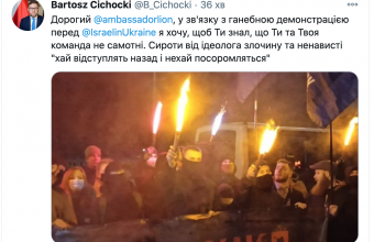 Польський посол написав (зберігаємо помилкову орфографію оригіналу): "Дорогий @ambassadorlion, у зв'язку з ганебною демонстрацією перед @IsraelinUkraine я хочу, щоб Ти знал, що Ти та Твоя команда не самотні. Сироти від ідеолога злочину та ненависті "хай відступлять назад і нехай посоромляться".