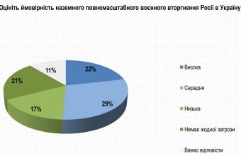 Загалом, 22% оцінюють ймовірність наземного повномасштабного воєнного вторгнення Росії в Україну як високу, 29% - як середню, 17% - як низьку. Кожен п’ятий вважає, що немає жодної загрози, кожен десятий не визначився. Вищий рівень загрози вторгнення бачать респонденти на Заході та в Центрі країни, нижче – на Півдні та Сході.
