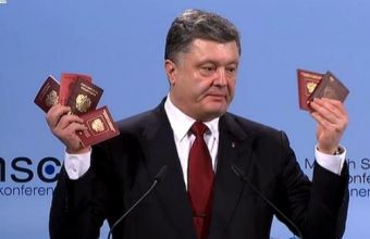 Президент Петро Порошенко продемонстрував сьогодні, 7 лютого, під час виступу на безпековій конференції у Мюнхені паспорти й військові квитки російських військових, які «заблукали в Україні» та були затримані нашими силовиками. При цьому Порошенко заявив, що у збройному конфлікті на сході України загинули 1432 солдата, вбито понад 5600 мирних громадян.