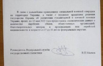 "У зв'язку з проведенням спеціальної воєнної операції на території України, а також з недавно прийнятим рішенням держави Ізраїль про збільшення гуманітарної і військової допомоги Україні, прошу до 13 травня 2022 року надати статистичні дані про кількість єврейських общин, громадських організацій, благодійних центрів і осіб єврейської національності, що мешкають у федеральних округах, у віці від 27 до 50 років", - йдеться у листі в округи з Москви.
